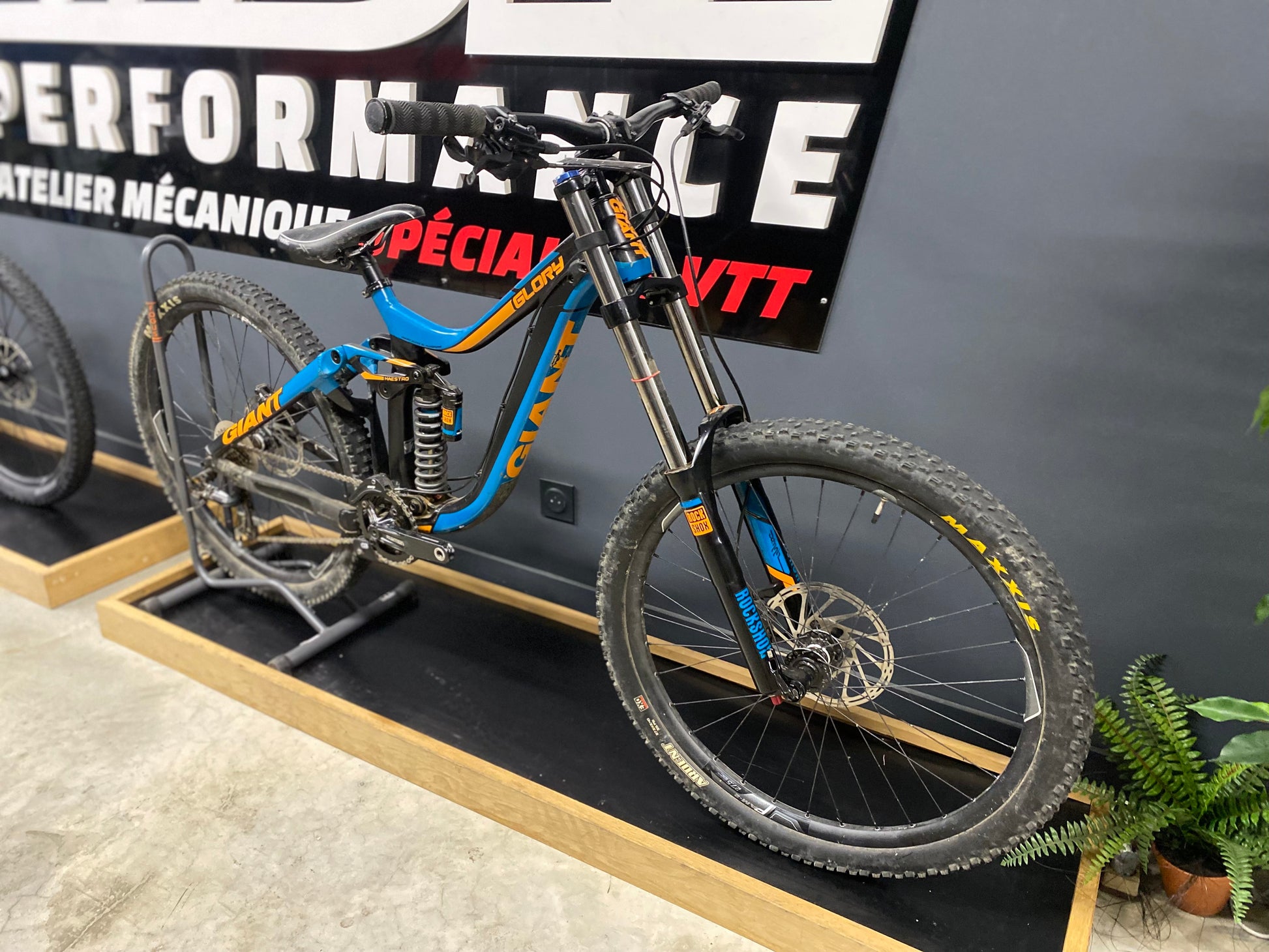 Giant Glory ALUXX SL Aluminium, suspension Maestro 200 mm, axe arriĂšre 12Ă150 mm DH, freins Postmount, transmission monoplateau, pneus jusquâĂ 2.5"